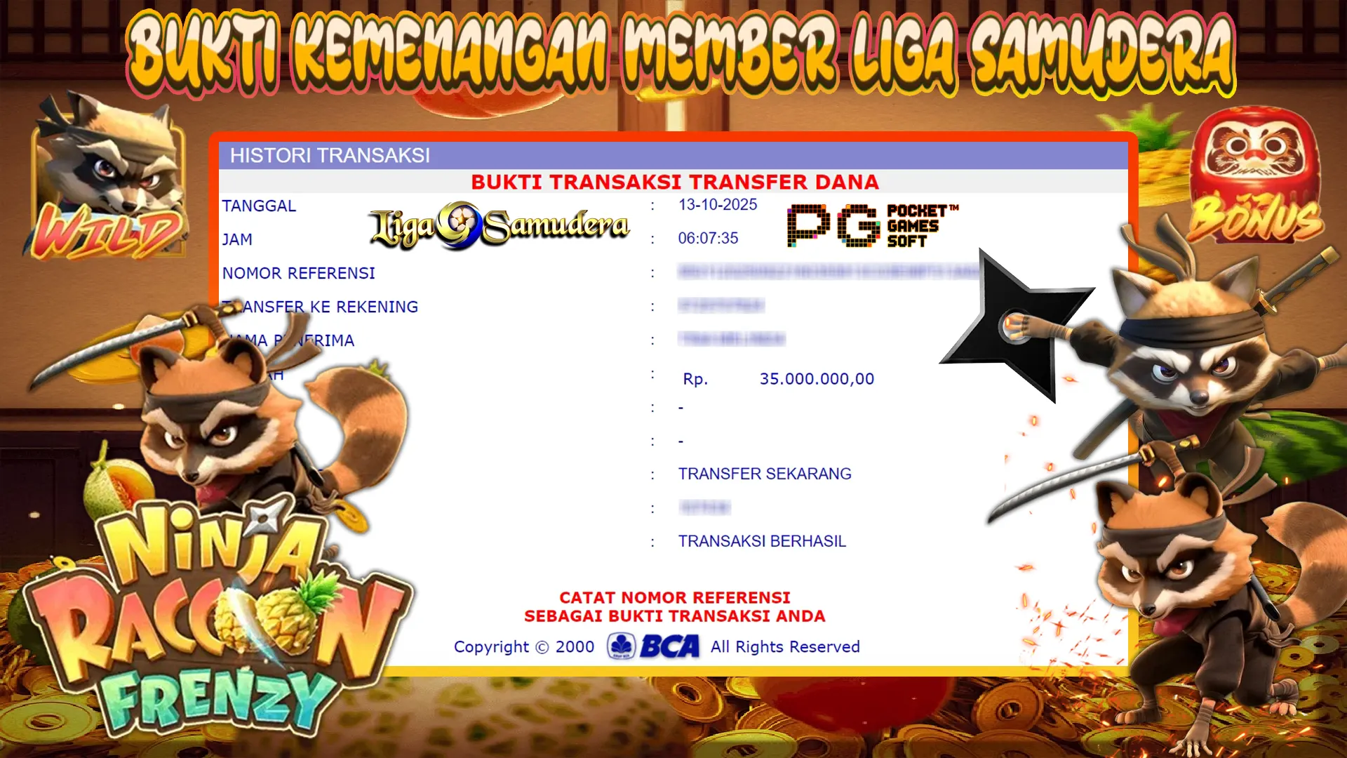 BUKTI KEMENANGAN BERMAIN PERMAINAN SLOT PG SOFT ” NINJA RACCOON FRENZY “